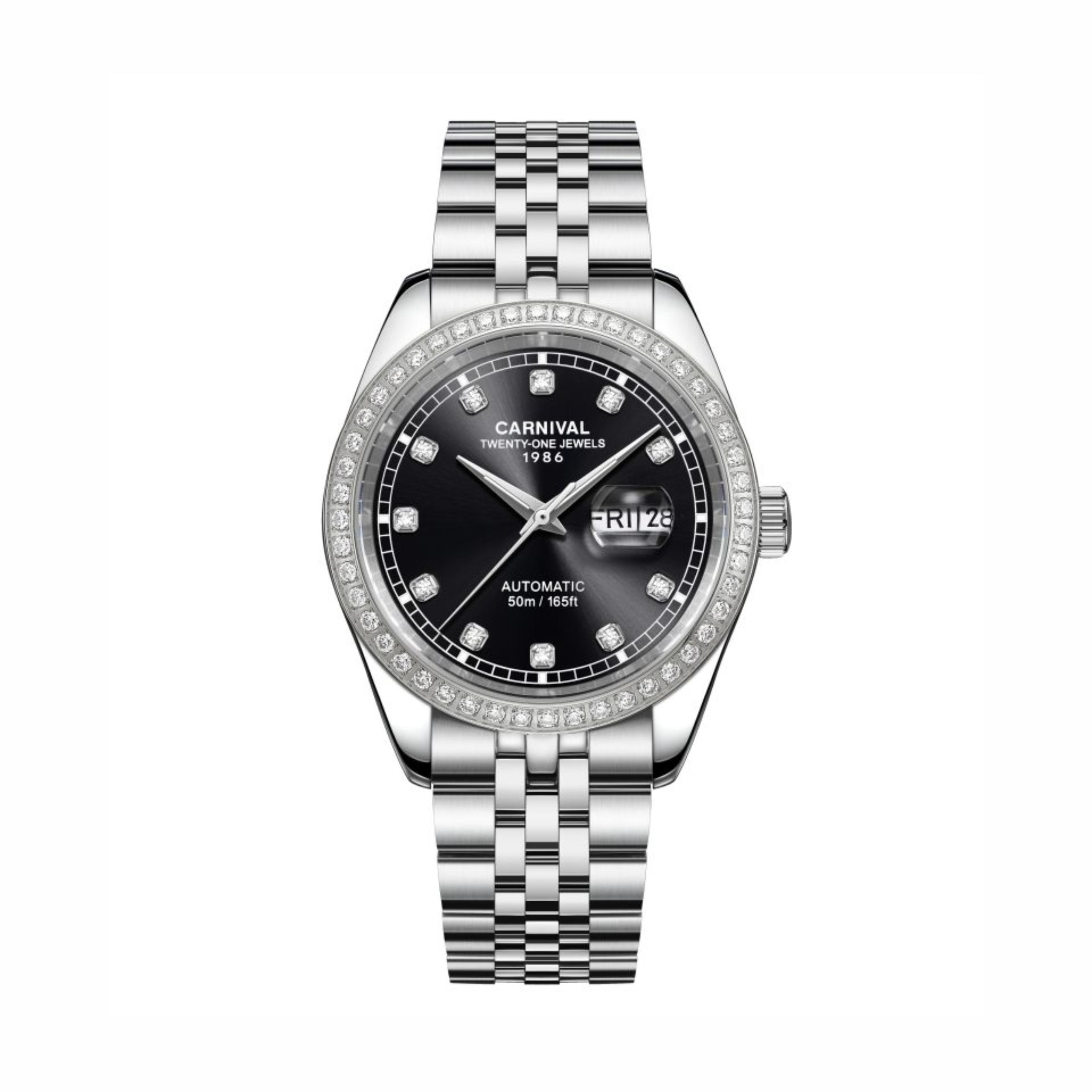 Mặt số màu đen sang trọng, nổi bật với các cọc số được đính đá Swarovski – chi tiết nhỏ nhưng tạo nên điểm nhấn đẳng cấp. Một ô lịch ngày được đặt tại vị trí 3 giờ, vừa thuận tiện khi sử dụng, vừa cân đối về mặt thiết kế.